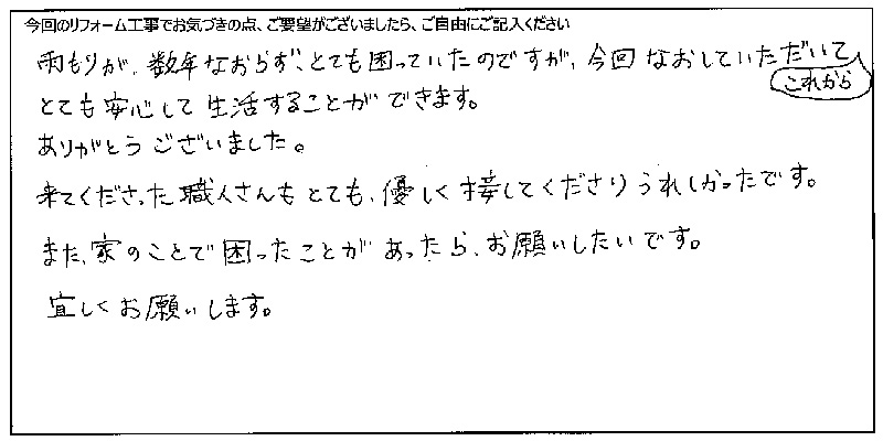 雨もりが、数年なおらず、とても困っていたのですが、今回なおしていただいてこれからとても安心して生活することができます。ありがとうございました。